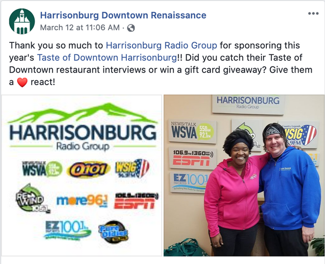 Earlier in 2020, I worked with the HDR Directors of Resources and Special Promotions to negotiate an annual partnership agreement with Harrisonburg Radio Group (HRG) to ensure that Taste of Downtown would receive radio coverage at no monetary cost to us. HRG was featured prominently as the presenting sponsor of the event in return for trade radio time. I wrote a script for a 30-second spot that enjoyed frequent air time across all HRG stations in the weeks leading up to and of the event. I also coordinated both on-air interview time and a radio giveaway campaign in which interested restaurants provided me with a gift card that would be given away on-air by HRG DJs the week of Taste of Downtown, which secured additional promotional coverage for both the event week and the individual restaurants.